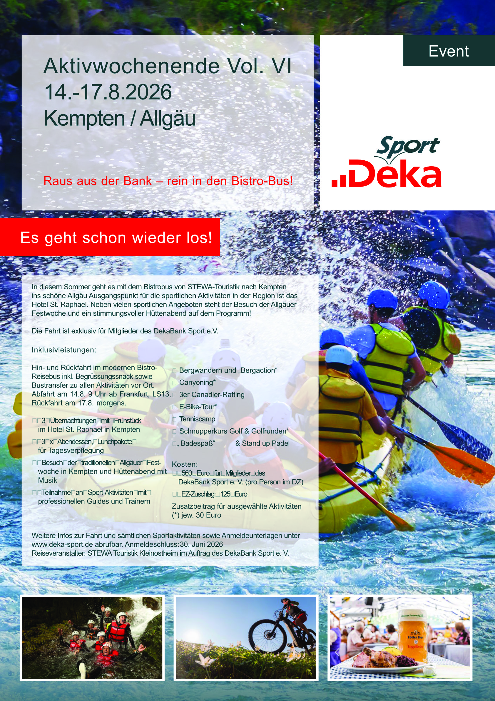 In diesem Sommer geht es mit dem Bistrobus von STEWA-Touristik nach Kempten ins schöne Allgäu Ausgangspunkt für die sportlichen Aktivitäten in der Region ist das Hotel St. Raphael. Neben vielen sportlichen Angeboten steht der Besuch der Allgäuer Festwoche und ein stimmungsvoller Hüttenabend auf dem Programm!