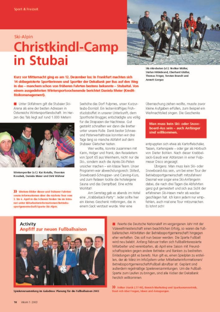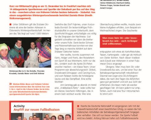 Ende des Jahres ging es wieder zum Skifahren in die Alpen. Auch (Après-)Ski-Einsteiger waren willkommen. Im folgenden Jahr sollten die Fussball-Aktivitäten wieder ausgebaut werden. Volker Starck startete einen Aufruf zur Neugründung der Sparte. Zahlreiche Kollegen waren beim Start einer erfolgreichen Fussball-Ära mit dabei.