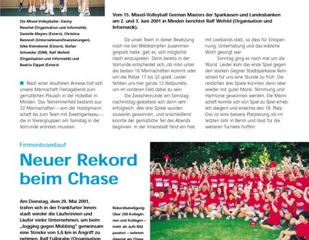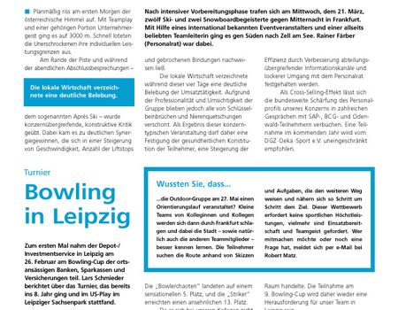 2001 ging es zu einer Skitour nach Zell am See. Der Standort Leipzig meldete sich erstmals sportlich. Dabei nahm das Bowling-Team an einem Vergleichswettkampf mit Sparkassen teil. Immerhin gab es Platz 5 zu bejubeln.