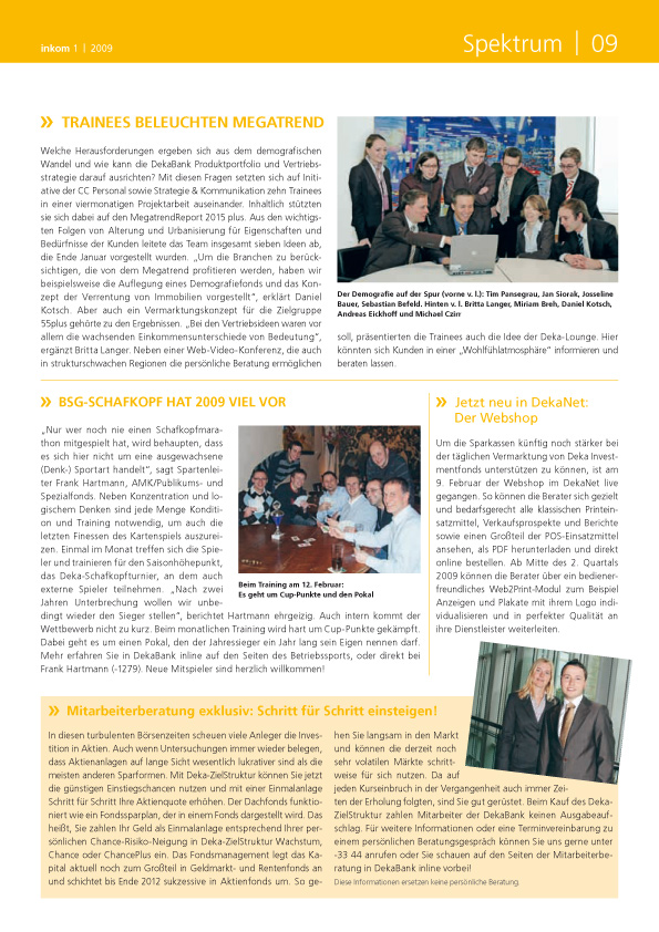 2009 meldeten sich die Schafkopfspieler zu Wort. Wöchentlich wird kräftig für große Ziele „trainiert“. Das Volleyball-Team erreichte beim Heimturnier das Finale. Beim Sparkassenmarathon in Köln konnten die Deka-Läufer wieder vorne mitmischen.