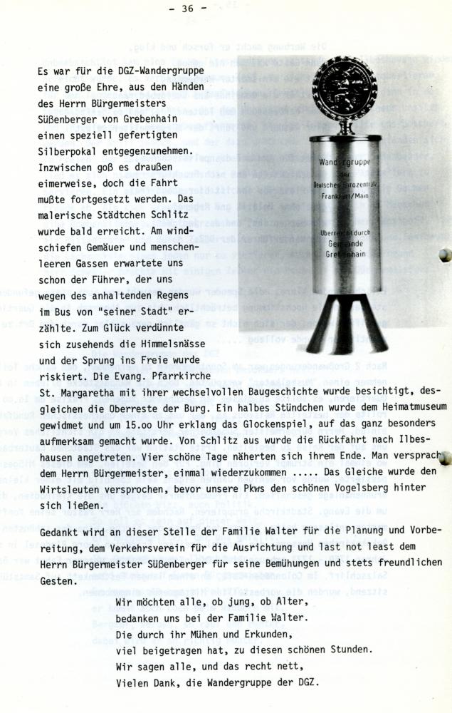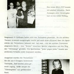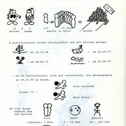 Eine ganze Reihe "vereinsinterner" Turniere fand statt, z.B. Preisskat oder Tischtennis (1. Bild) 1976/1977 war "Bowling" der absolute Hit: (2. Bild) Hier wird von einem Wanderausflug nach Schlitz berichtet. Wofür es diesen schönen Pokal gab, wurde aber nicht erzählt. (3. Bild) "Trimm mal wieder" war das Betriebssport-Motto der späten 70er Jahre (letztes Bild).