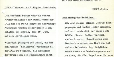 Schon vor dem Start der Betriebssportgemeinschaft kämpften die Fussballer von DGZ und DEKA um die Ehre. Bis zur Fusion ging es immer eng zu. Hier siegte die DGZ knapp mit 4:3 gegen die DEKA: Im letzten Vergleich vor der Fusion trennte man sich 6:6 Unentschieden.