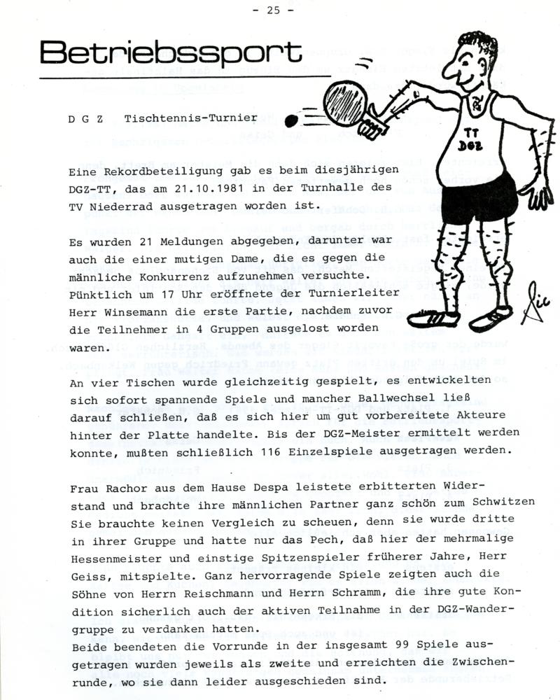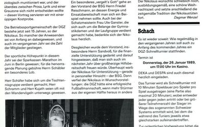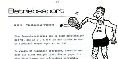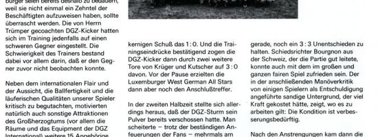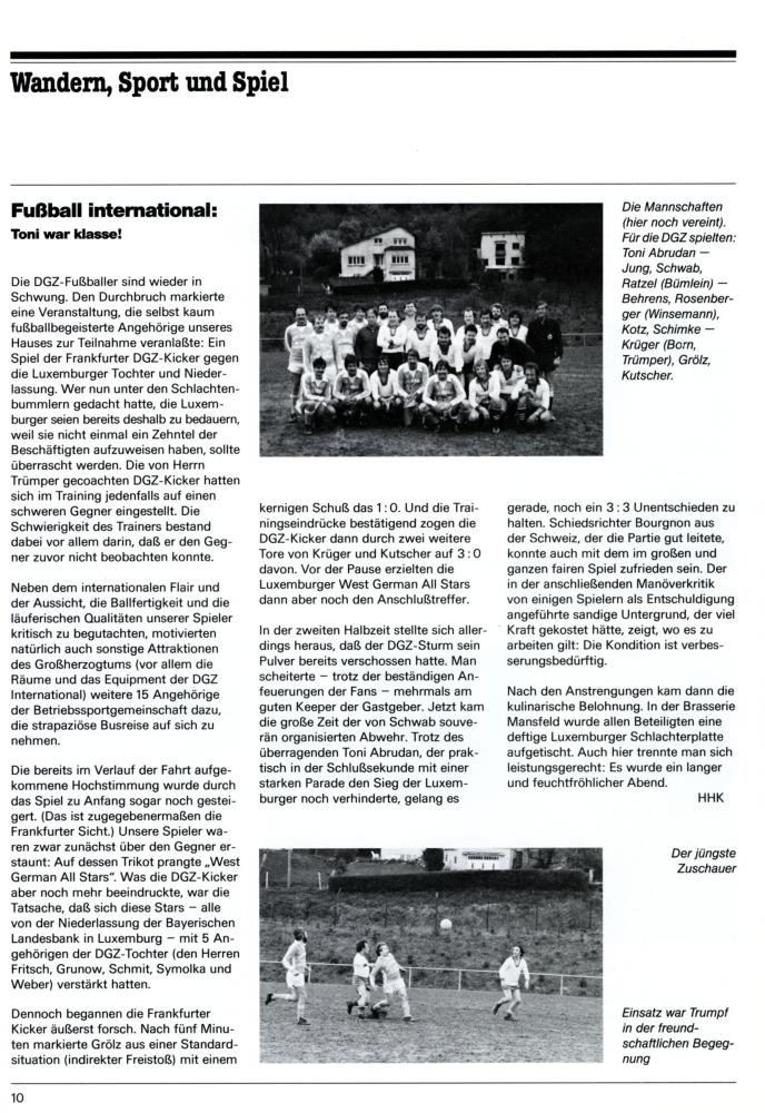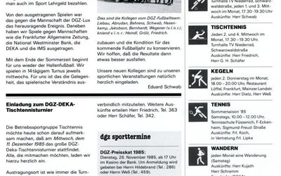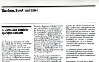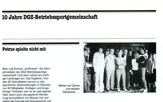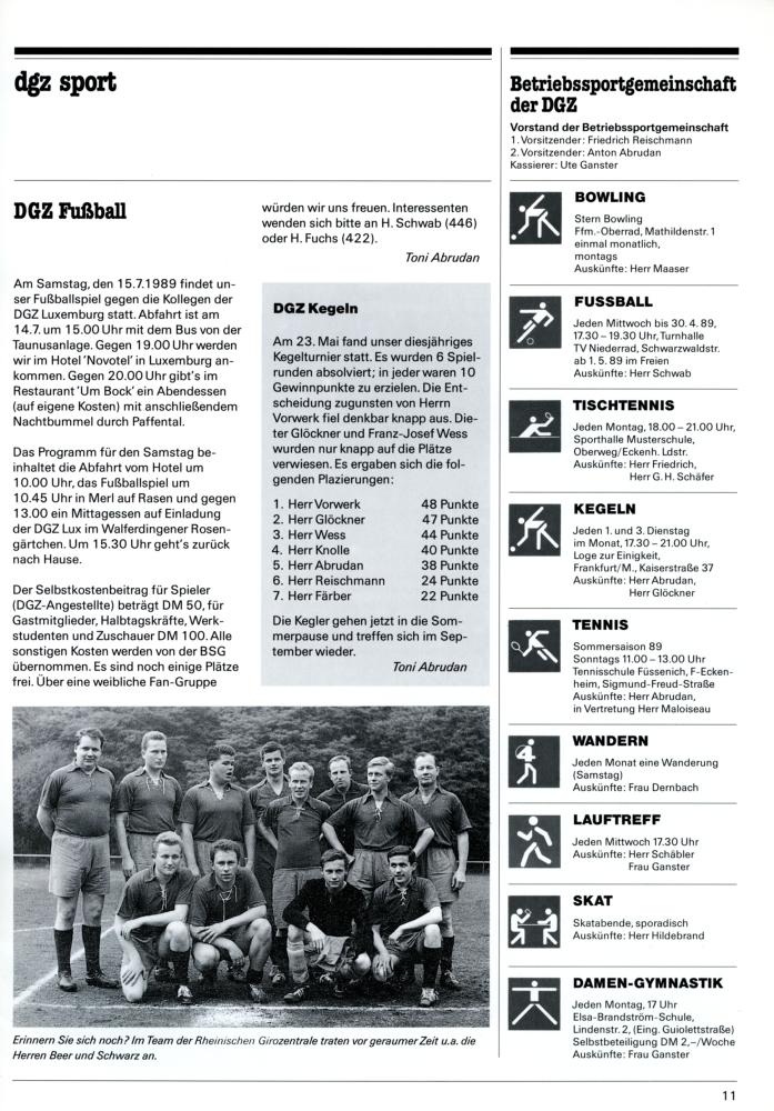 Bei den Fussballern der DGZ stand das Auswärtsspiel in Luxemburg an. Mitfahren durften auch „Halbtageskräfte“ und „Werkstudenten“. Diese wurde für die Mitfahrt stolze 100 DM „abgenommen“, während die DGZ-Mitarbeiter nur 50 DM berappen mussten. Hatte das etwa noch ein „Nachspiel“ in der Personalvertretung? Mit im Bericht der DGZ-Aktuell war auch noch ein Bild aus der „guten alten Zeit“ abgedruckt. Gezeigt wird das Fussballteam der „Rheinischen Girozentrale“. (Vorläufer der WestLB, die es inzwischen auch nicht mehr gibt.)